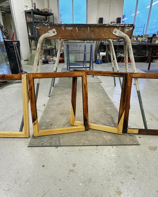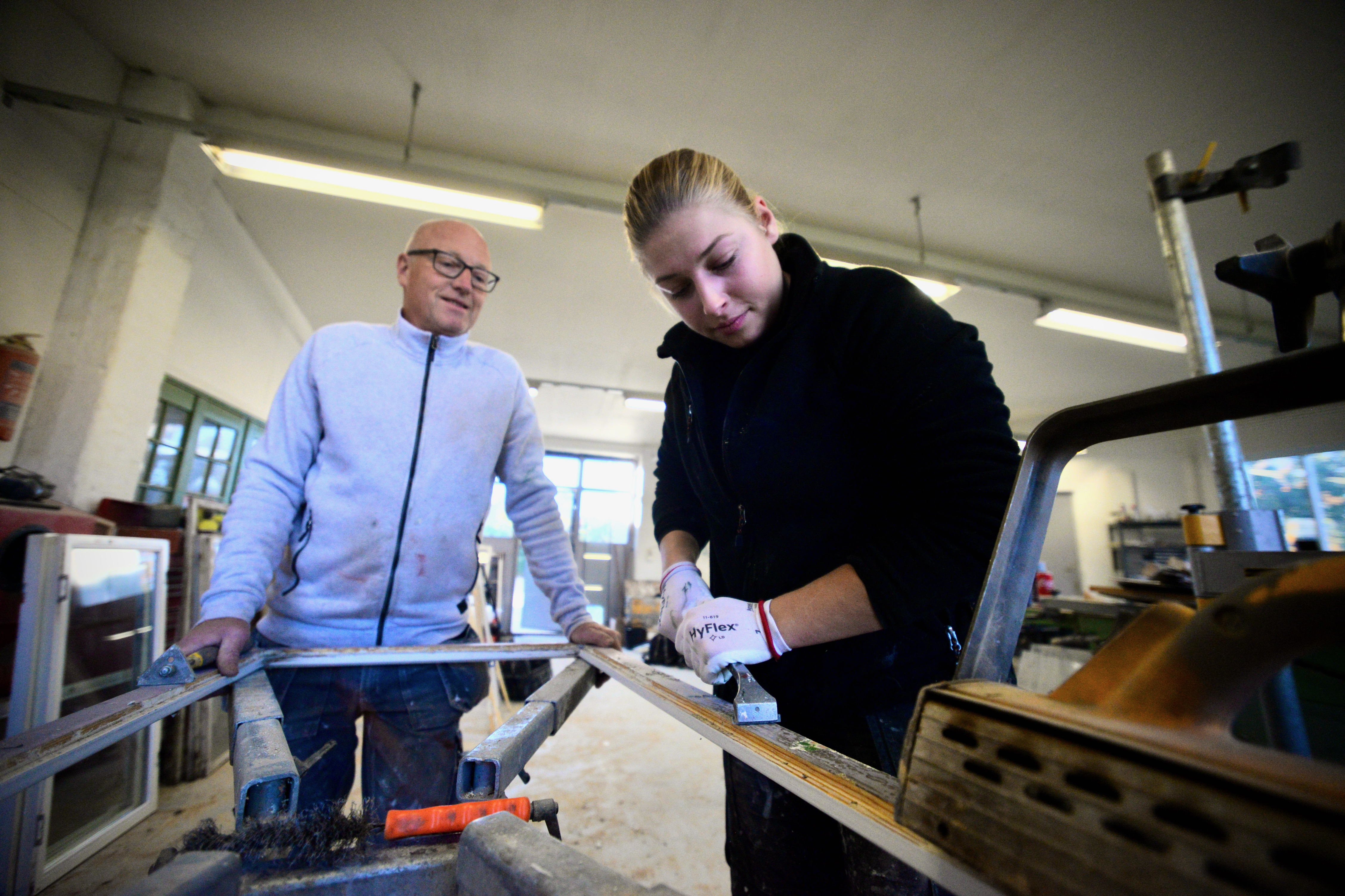I verkstaden avlägsnas kitt från bågarna och glasen plockas ur.