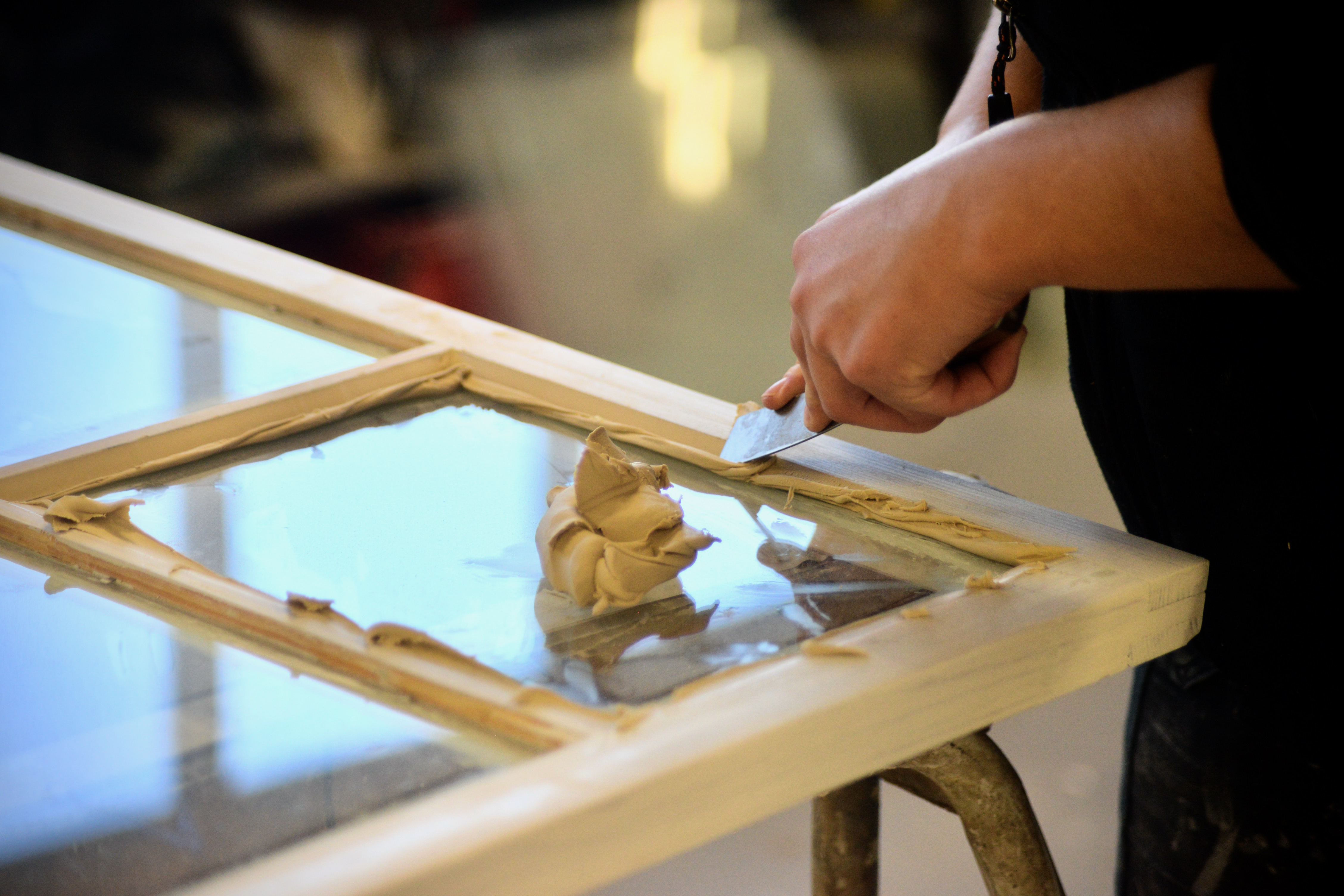 Tryckkitt läggs i falsarna och bågarna får tillbaka sina tidigare glas och kittas.