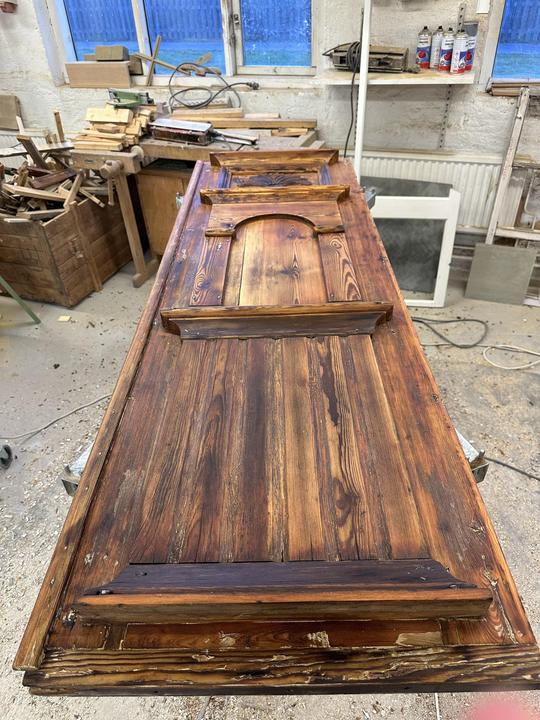 Karmen skrapas ren från färg, lagas vid behov, slipas, oljas och grundmålas. Täcks sedan med fönsterskydd.